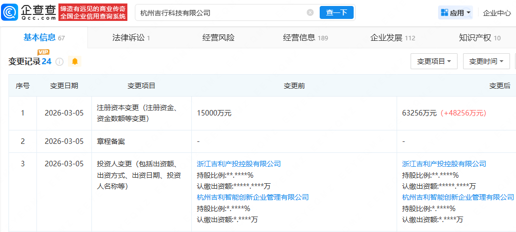 近日,杭州吉行科技有限公司发生工商变更,B体育(Bsports)官方网站注册本钱由1.5亿东谈主民币增至约6.3亿东谈主民币,b体育官方app下载增幅约322%。企查查流露,该公司开辟于2017年11月,法定代表东谈主为徐晓峰,由浙江祥瑞产投控股有限公司、杭州祥瑞智能翻新企业处理有限公司共同握股。