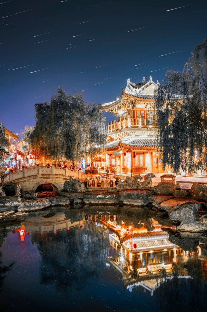 夜晚的古镇尤其迷东谈主,灯火点亮河岸,反照在波光中,仿佛一幅流动的水墨画。
