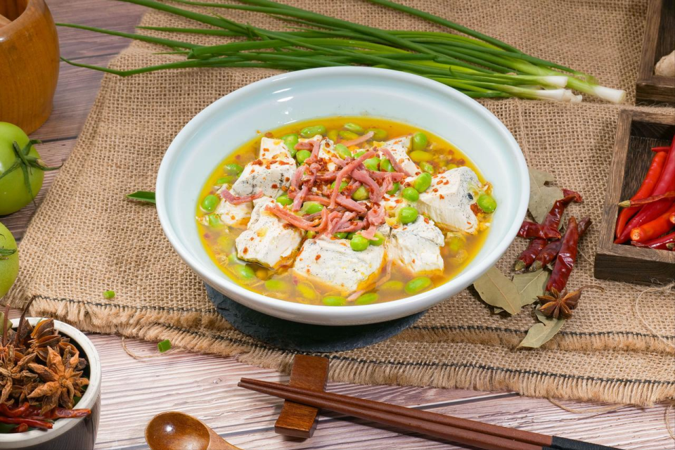 嫩豆腐切块,毛豆剥粒。锅里烧水,水绽放入豆腐和毛豆,煮5分钟,加盐、白胡椒粉、几滴香油,终末撒一把葱花。