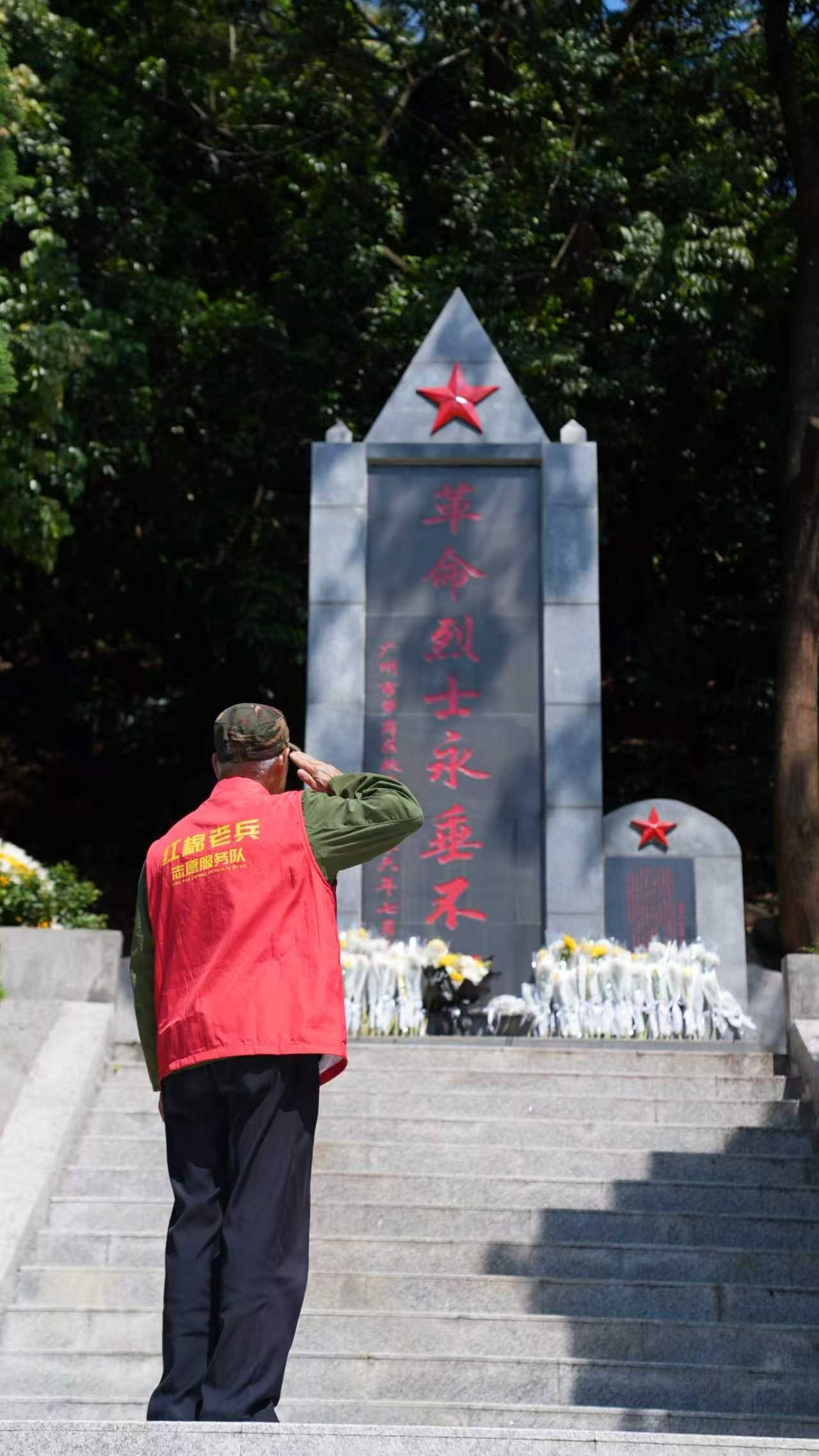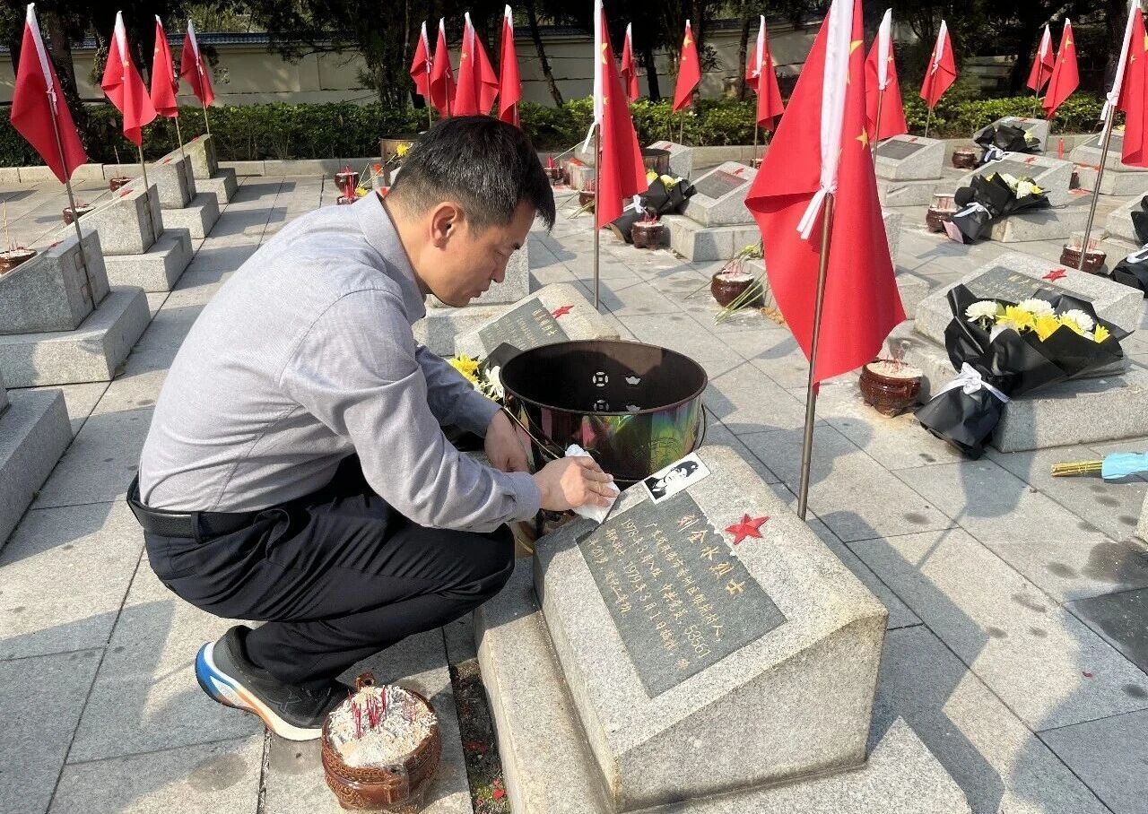 在深圳市龙华区龙园社区,红星志愿者仔细计帐顾虑碑及临近环境。擦抹碑身、清扫台阶、整理义士墓,一位老兵志愿者说:“把这里打理干净,让英豪们住得自得。”