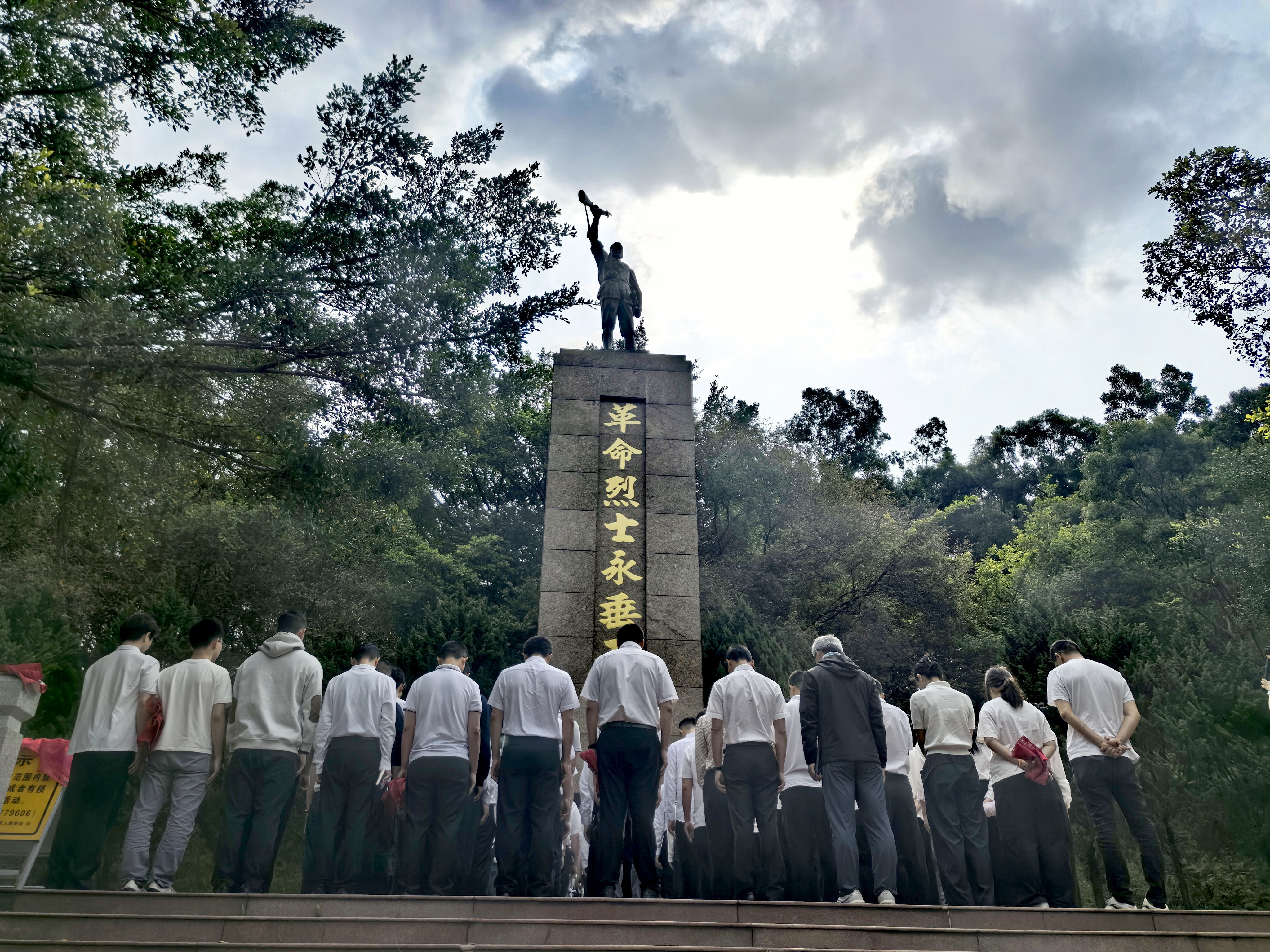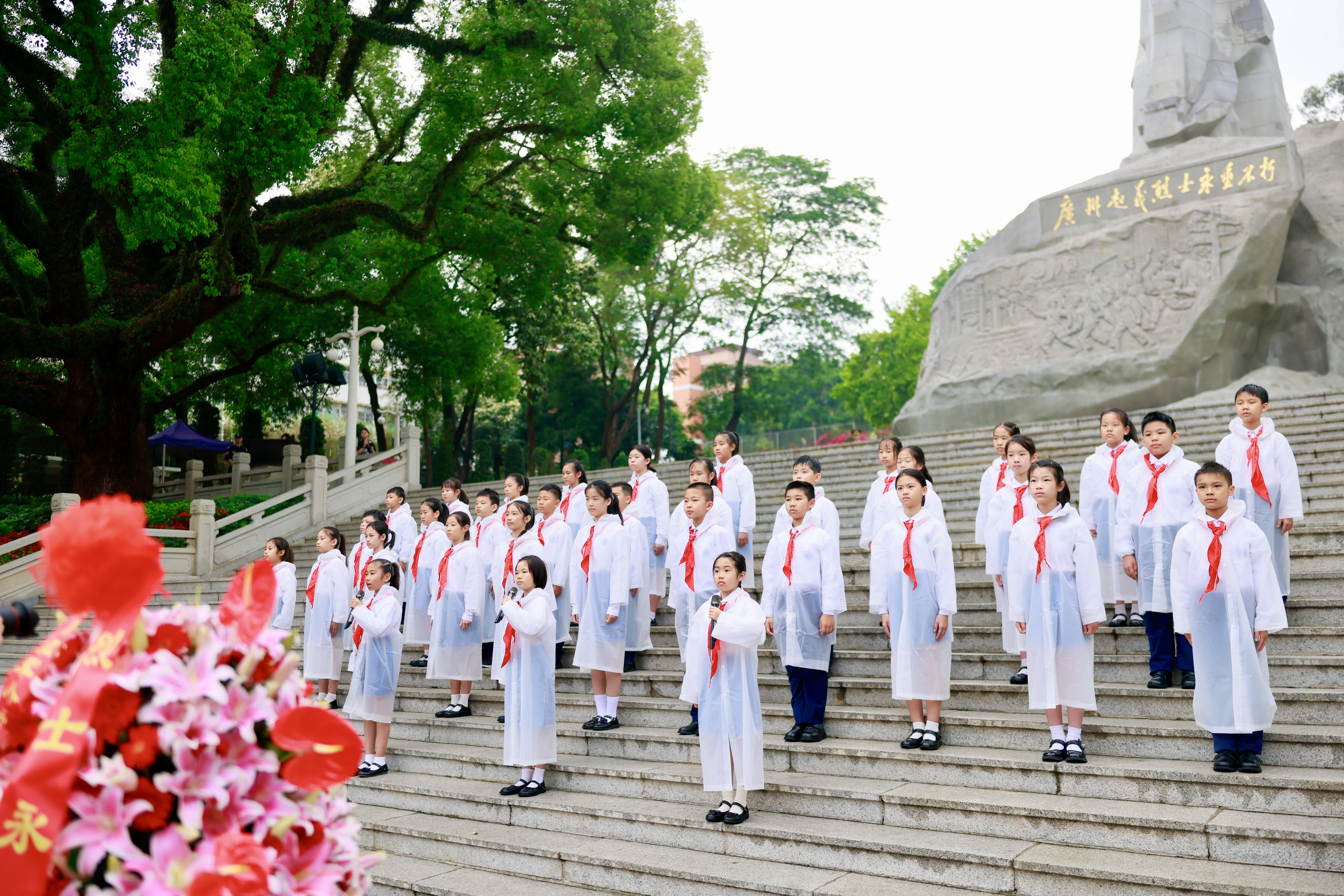 汕尾市城区鼎盖山立异义士陵寝内,汕尾市退役军东谈主事务局王人集驻汕某军队、区退役军东谈主事务局,组织退役军东谈主代表及两所小学师生代表,在顾虑碑前敬献鲜花、肃立致哀。