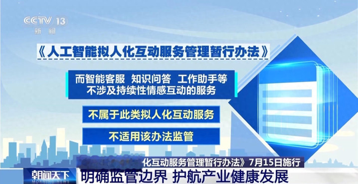 《东说念主工智能拟东说念主化互动干事不断暂行方针》将于本年7月15日履行,有关企业也要加速合规准备,以促进行业步入“安全有序、进取向善”的发展新阶段。
